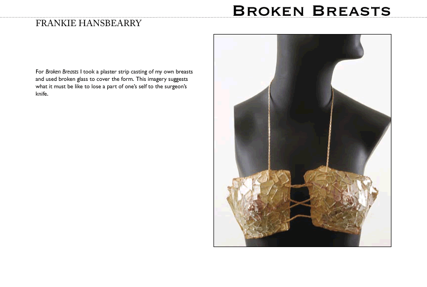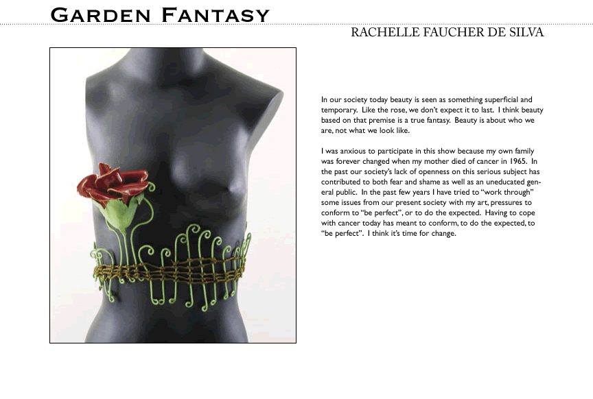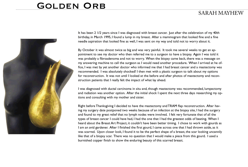 The Breast Art sculptures show us what mastectomy can be like when the veils of shame and fear are lifted. We can look at breasts and their absence with new interest, without fear or pity. As we look at breast cancer and mastectomy straight on, we can find inspiration in the idea that a woman who has lost a breast to breast cancer may feel that she has become more of a woman, not less of a woman.