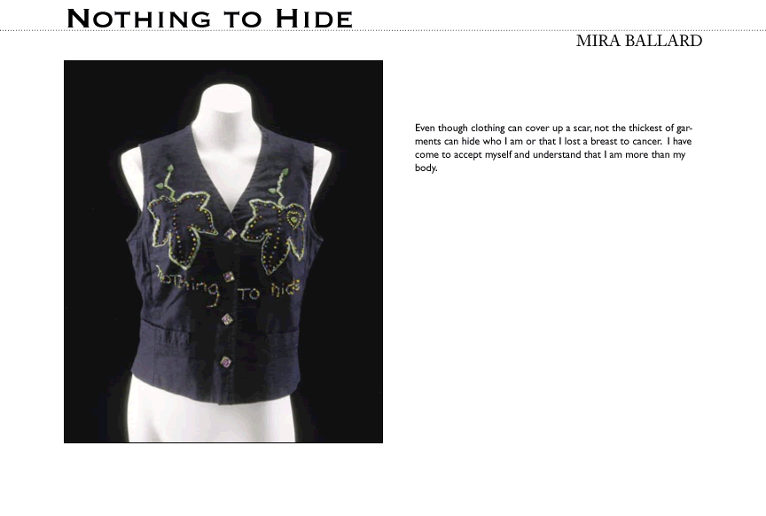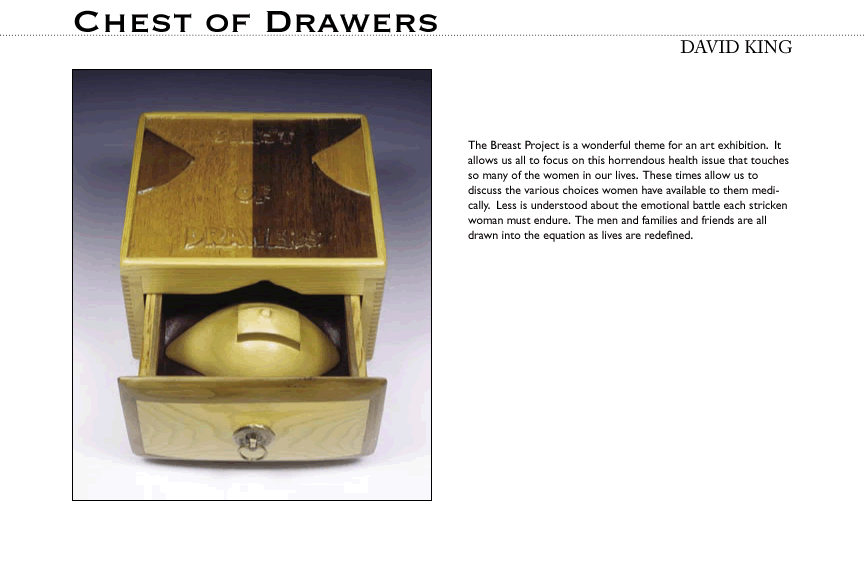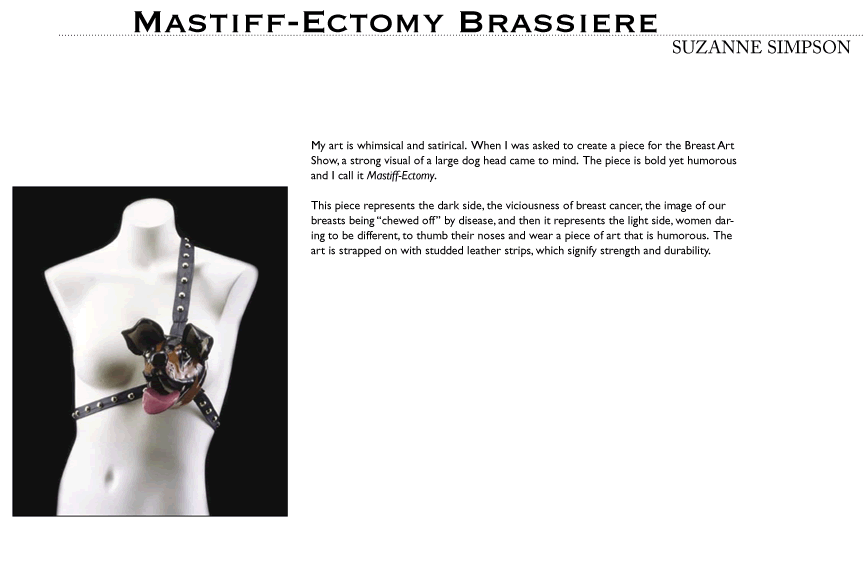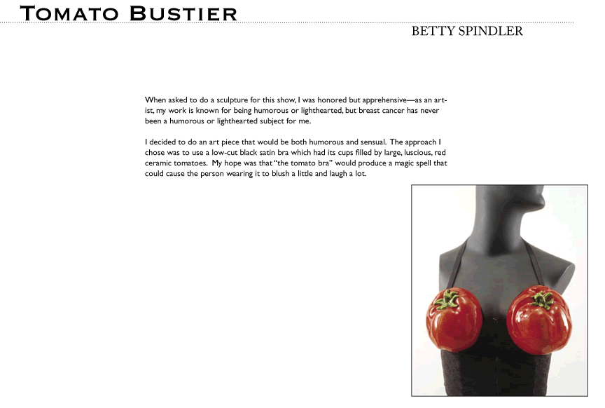 Art and design reveal complexity while highlighting what is most important. The artists participating in this exhibit accepted an invitation to make sculptures in the form of breast prostheses. Some of the artists are women who have experienced breast cancer, but many are not. No matter who they were, the artists used the very thing that conceals the effects of breast cancer to reveal things that can guide our collective response to this complex disease.